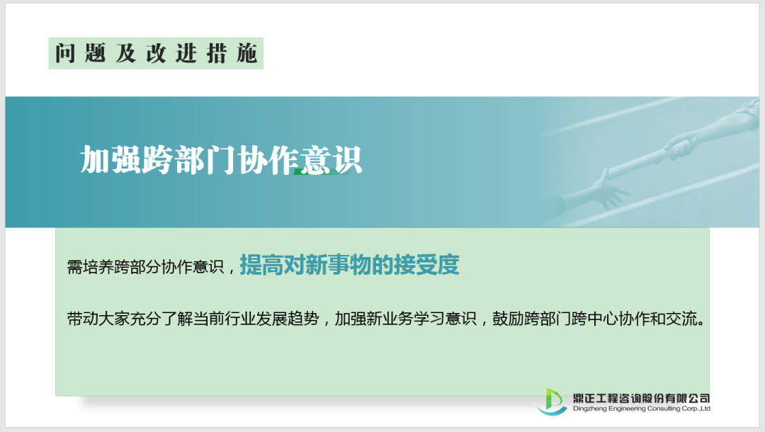 會議的最后,公司領導表示,在工作中要多做統籌協調、多做成果輸出,努力開拓新型業務模式;積極營造良好的學習氛圍,共同打造學習型咨詢企業;部門之間主動加強聯動,共同推進全過程工程咨詢業務穩步發展;在新的“五年計劃”中群策群力,攜手共同實現工程咨詢企業高質量發展戰略目標,為實現“十四五”戰略目標貢獻自己的力量。
