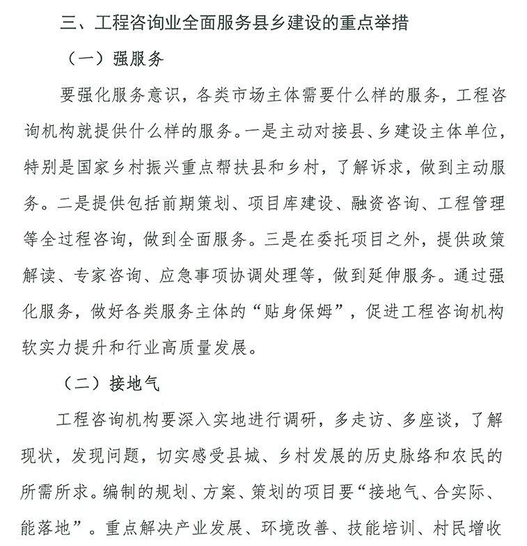 縣城城鎮化建設、鄉村建設是一項宏大的社會工程,需要整體的、長遠的規劃。特別是城鄉“二元”化結構較為明顯,大部分鄉鎮和村莊發展規劃欠缺,村落布局散亂,公共服務供給不足,嚴重制約了縣城、鄉村發展。規劃咨詢,注重規劃先行,因地制宜,可運用工程技術、科學技術、經濟管理和法律法規等多學科的知識與經驗,為縣城建設項目決策提供智力服務,解決縣城發展與定位問題,避免錯亂發展,無效競爭。
