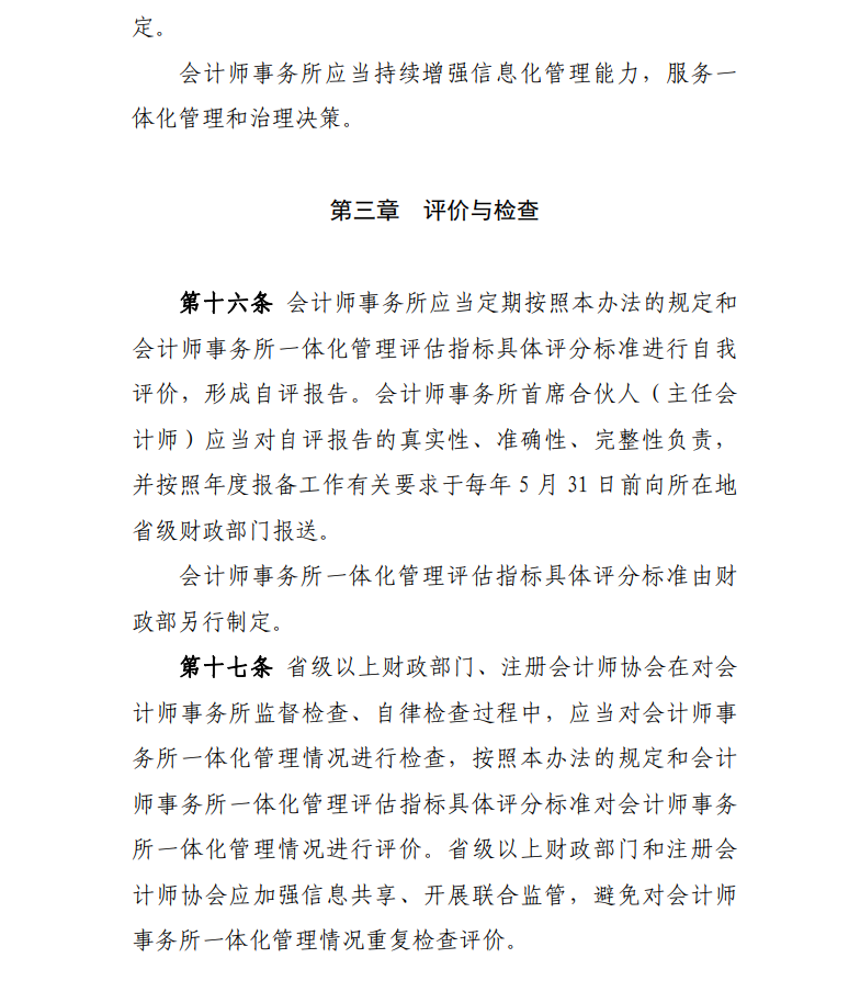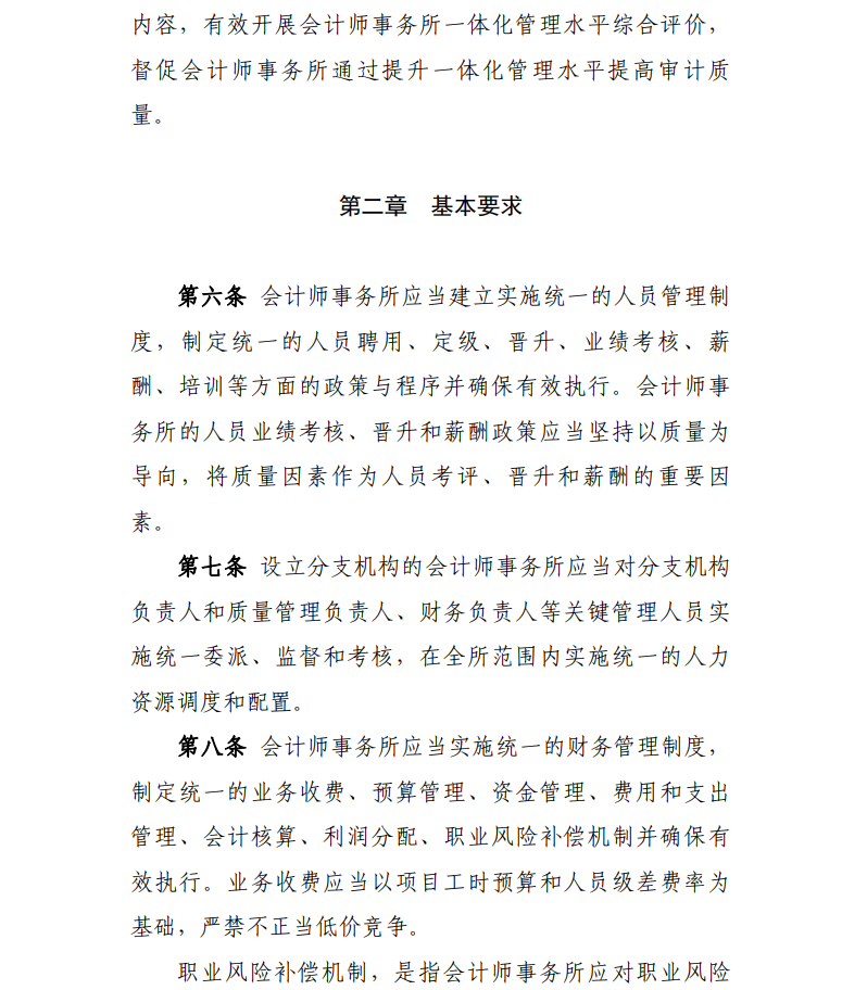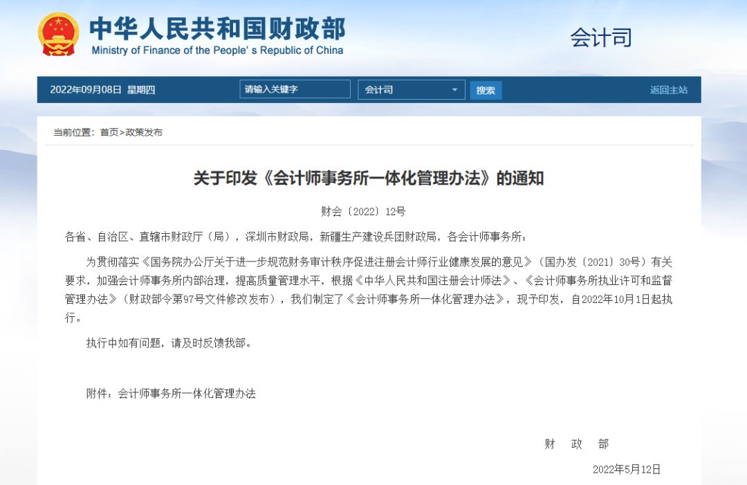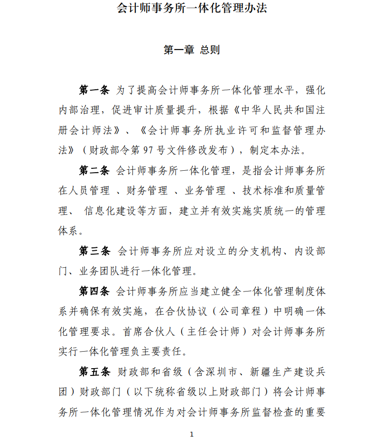 為貫徹落實(shí)《國務(wù)院辦公廳關(guān)于進(jìn)一步規(guī)范財務(wù)審計秩序促進(jìn)注冊會計師行業(yè)健康發(fā)展的意見》(國辦發(fā)〔2021〕30號)有關(guān)要求,加強(qiáng)會計師事務(wù)所內(nèi)部治理,提高質(zhì)量管理水平,根據(jù)《中華人民共和國注冊會計師法》、《會計師事務(wù)所執(zhí)業(yè)許可和監(jiān)督管理辦法》(財政部令第97號文件修改發(fā)布),我們制定了《會計師事務(wù)所一體化管理辦法》,現(xiàn)予印發(fā),自2022年10月1日起執(zhí)行。