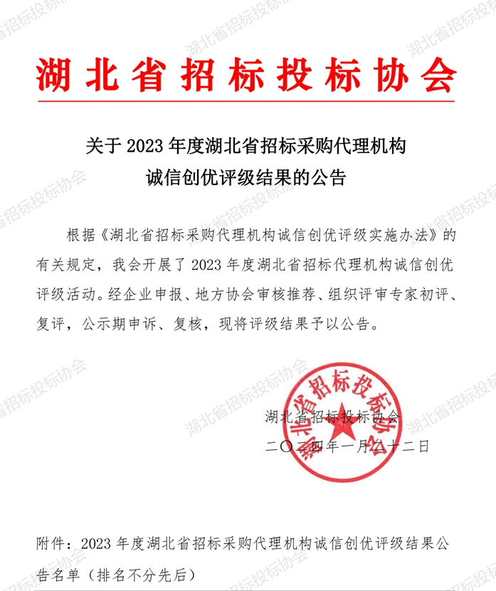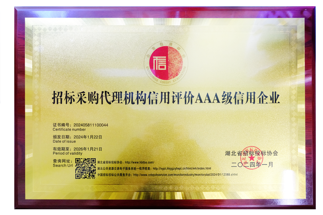 近日,鼎正憑借誠(chéng)信的經(jīng)營(yíng)理念、良好的企業(yè)信譽(yù)和優(yōu)質(zhì)的服務(wù)質(zhì)量,榮獲由湖北省招標(biāo)投標(biāo)協(xié)會(huì)認(rèn)定的最高等級(jí)“招標(biāo)采購(gòu)代理機(jī)構(gòu)信用評(píng)價(jià)AAA級(jí)信用企業(yè)”稱號(hào)。