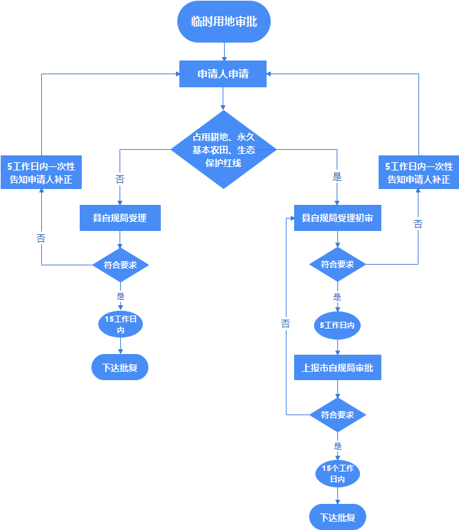 1、申請人向臨時(shí)用地所在地的縣(市、區(qū))自然資源主管部門提出申請,由縣(市、區(qū))自然資源主管部門負(fù)責(zé)辦理臨時(shí)用地審批。