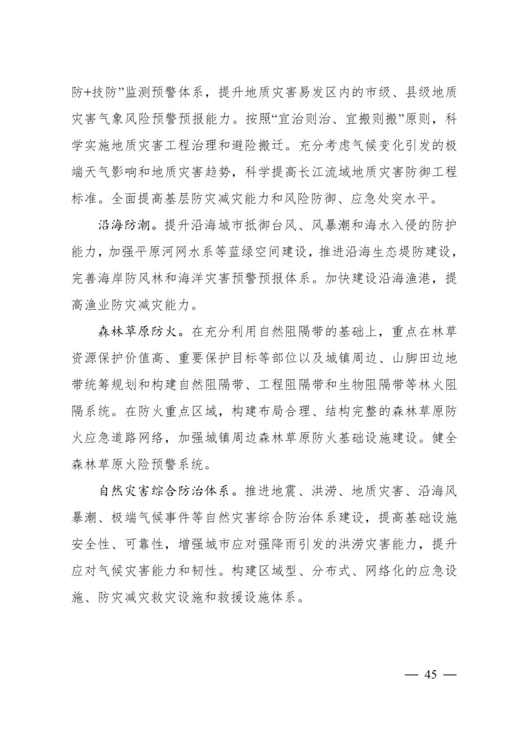 推進地震、洪澇、地質災害、沿海風暴潮、極端氣候事件等自然災害綜合防治體系建設,提高基礎設施安全性、可靠性,增強城市應對強降雨引發的洪澇災害能力,提升應對氣候災害能力和韌性。構建區域型、分布式、網絡化的應急設施、防災減災救災設施和救援設施體系。