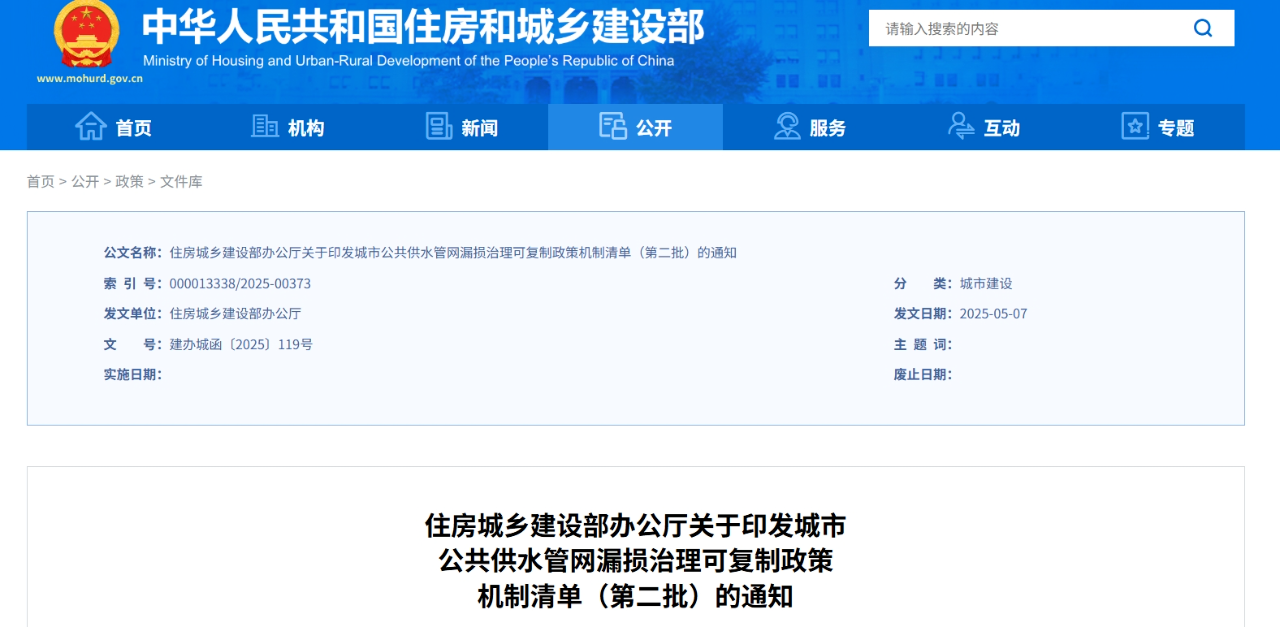 為加強(qiáng)城市公共供水管網(wǎng)漏損治理,健全長效機(jī)制,近日,住房城鄉(xiāng)建設(shè)部、國家發(fā)展改革委遴選了50個城市和縣城重點(diǎn)推進(jìn),梳理形成了城市公共供水管網(wǎng)漏損治理可復(fù)制政策機(jī)制清單(第二批)。