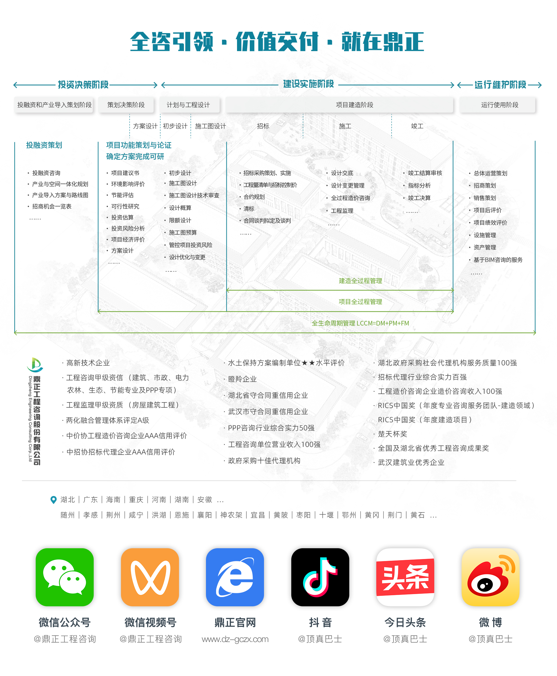 業績涉及各類公建、工業、能源、環保、交通、市政、城市軌道、國土整治等行業,包括海內外各類建設項目的工程咨詢、工程招標代理、工程造價咨詢、項目管理等咨詢業務...