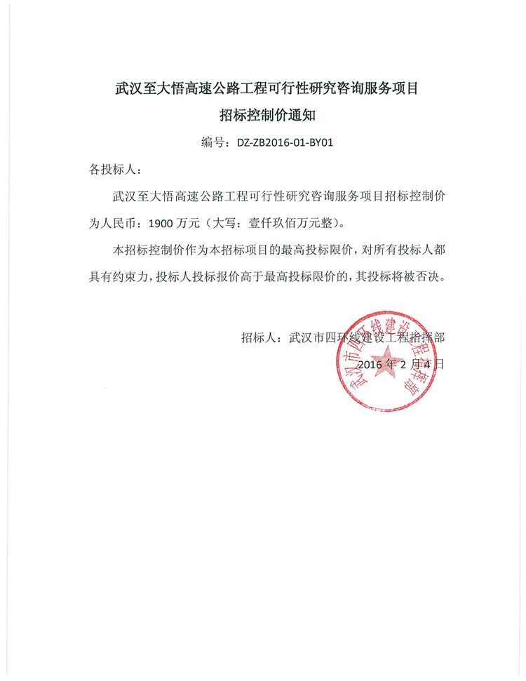 武漢至大悟高速公路工程可行性研究咨詢服務項目招標控制價通知