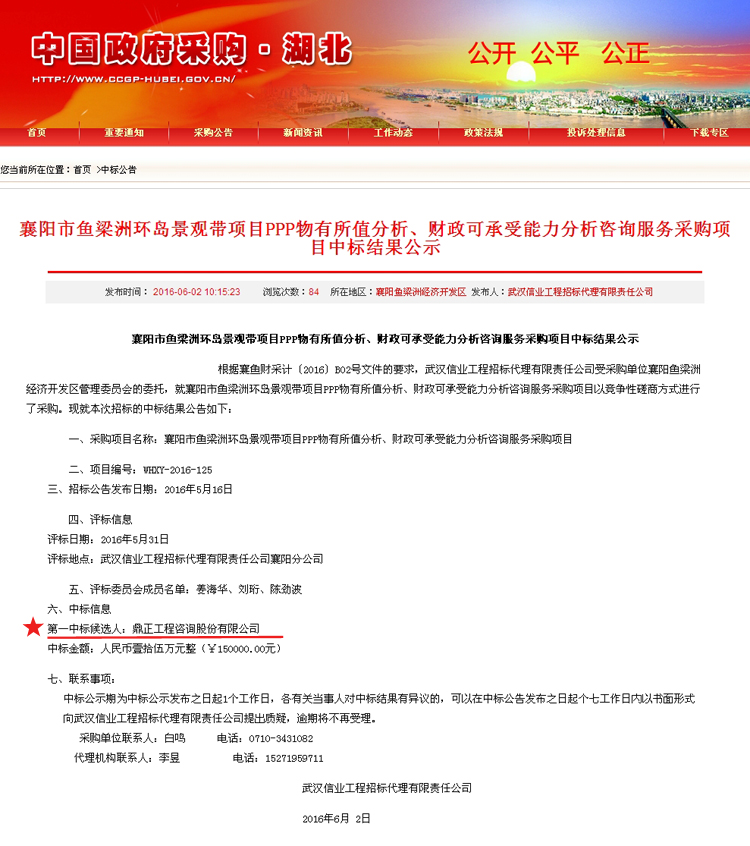 【經(jīng)營成果】我司中標襄陽市魚梁洲環(huán)島景觀帶項目PPP物有所值分析、財政可承受能力分析咨詢服務?采購項目