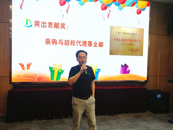 值得一提的是,今年七月我司憑借專業的服務、完善的內控制度從近千家政府采購代理機構中脫穎而出,獲得首屆“全國政府采購百強代理機構(2018-2019年度)”榮譽稱號,這一榮譽稱號離不開采購與招標事業部全體成員積極主動的參評。董事長王雁然為采購與招標事業部頒發突出貢獻獎,并號召大家向采購與招標事業部學習大局意識和吃苦耐勞的工作作風。