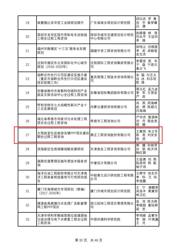 2019年12月27日,中國工程咨詢協(xié)會公布了“2018年度全國優(yōu)秀工程咨詢成果獎”獲獎項目名單,由鼎正咨詢獨立編制完成的《大悟縣宣化店旅游名鎮(zhèn)建設(shè)PPP項目全過程工程咨詢報告》榮獲全國優(yōu)秀工程咨詢成果三等獎!